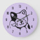 Eine Uhr entwarf mit einer Illustration einer lächelnden und wellenartig bewegenden Miezekatzekatze mit einem schwarzen Fleck um sein Ohr. Lila Hintergrund. Einfaches niedliches und entzückend.