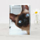 NIEDLICHES SIAMESE CAT PEEKING IN DER KARTE, UM GLÜCKLICHE BIRTHDAY KARTE ZU SAGEN