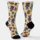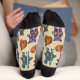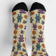 Diese gemusterten Halloween-Socken sind voller Kutschheit. Es zeigt niedlich gestopfte Tiere mit einigen Skeletten, die für ein etwas unheimliches Aussehen sorgen, sowie einige gepatchte Kürbisse. Es gibt eine Fledermaus, einen Bären, eine Katze, einen Hund und ein Kaninchen. Die Tiere und Kürbis sind in Holzkohlefarben grau, lila, aquamarin und orange gehalten und haben einen cremefarbenen Hintergrund.