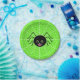 Diese niedliche kleine schwarze Spinne sitzt auf seinem Netz mit einem großen Lächeln auf seinem Gesicht. Hintergrund ist ein grünes gepunktetes Muster.