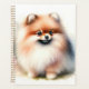 Ein flauschiger Spitz mit einem blühenden Orange- und Weißmantel mit großen, ausdrucksstarken Augen und einem fröhlichen Ausdruck. Es liegt inmitten weicher, pastellfarbener Blume und sanfter Aquarellpracht und schafft eine warme und einladende Atmosphäre. Der Hintergrund ist hell und luftig, was das Fell des Hundes und sein spielerisches Verhalten verstärkt.