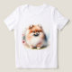 Ein flauschiger Spitz mit einem blühenden Orange- und Weißmantel mit großen, ausdrucksstarken Augen und einem fröhlichen Ausdruck. Es liegt inmitten weicher, pastellfarbener Blume und sanfter Aquarellpracht und schafft eine warme und einladende Atmosphäre. Der Hintergrund ist hell und luftig, was das Fell des Hundes und sein spielerisches Verhalten verstärkt.