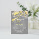 Graue und gelbe, rustikale Save the Date Postkarten mit niedlichen und extravagant blühenden Baumzweigen und hängenden Lichterketten. Ideal Save the Date für Hochzeiten im Freien.