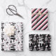 Papierfolien für Haarstylist mit zwei verschiedenen Mustern: mit niedlichen Haarstyling-Werkzeugen in Schwarz-Weiß mit rosa Herzen; und ein diagonaler Streifen in Rosa, Schwarz und Weiß.