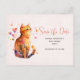 Save the Date Postkarte mit einer bezaubernden Aquarellbilder. Eine orangefarbene Tischkatze, die freundlich und glücklich mit herumwirbelnden Herzen aussieht.