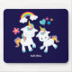 Ein Mousepad mit 2 niedlichen Tanzornen mit leuchtenden und farbenfrohen Schwänzen und Mane. Ein farbenfroher Regenbogen mit Wolken auf jeder Seite über ihren Köpfen. Andere Elemente sind eine kleine Blume ein Herz und einige Sterne. Dunkler lila Hintergrund.