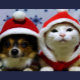 Niedlicher Hund und Katze mit Weihnachtsmänteln