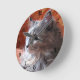 Ein nahes Foto einer niedlichen und flauschigen Graukatze.