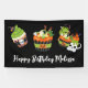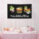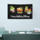 Halloween-Geburtstagsbanner mit Halloween-Kuchen und großem Augapfel. Ein grüner Popsikel in Form von Frankensteins Monster. Eine Tasse mit einem Schädelgesicht gefüllt mit Leckereien und tropfend grünem Goo.