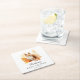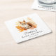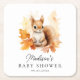 Niedliche Babydusche mit Holzdekor und Aquarellbildern, die von Herbstlauben in Orange-, Rot- und Gelbtönen umgeben sind. Das Baby Eichhörnchen Babydusche Untersetzer mit dem Namen und dem Datum der Babydusche. Entworfen, um mit unserer Niedlichen Woodland Animals Fall Baby Shower Kollektion zu koordinieren.