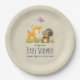 Personalisierte Baby-Duschpapier-Teller mit einer niedlichen Abbildung mit einem Hirsch und einem kleinen Eichhörnchen, das eine Eichel und einen Schmetterling über ihren Köpfen hält. Diese bezaubernden Waldkreaturen auf einem Gras stehend, mit einigen skurrilen Pilzen an den Füßen. Hintergrund hat einen braunen Kraftpapier-Look.