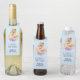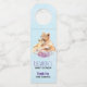 Flaschenanhänger mit einem niedlichen Aquarellgemälde von einer Mutter, die ihren Babykrug hält. Ein hübscher, lila Blumenstrauß unter ihnen fügt diesem süßen und zauberhaften Bild eine sanfte Touch hinzu. Hellblauer Hintergrund.