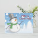 Niedlich Winter Snowman Frohe Weihnachtskarte. Dieses Design zeichnet sich durch niedlichen, lustigen Retro-Schneemann im Winter mit Weihnachtsbäumen und hübscher Cartoon-Typografie aus.