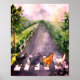 Eine niedliche Aquarell-Abbildung von rollendem Land und vier Hühnern, ein weißes, ein braunes und zwei schwarze Hühner, die die Straße in einer Linie überqueren. Eine lustige Ergänzung zu Ihrer Wohngestaltung.
