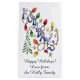 Vintager Illustrator Cartoon Frohe Weihnachtsfeiertage mit dem Wort "Feiertage" verpackt mit farbenfrohen gelben, roten und grünen Weihnachtsbeleuchtung. Umgeben von goldenen Sternen und einem Weihnachtsbaum aus dem Wald.