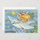 Vintage Illustration Frohe Weihnachtsbilder mit einem niedlichen Kaninchen, gekleidet als fröhlicher Weihnachtsmann mit einem Sack voller Kaninchennahrung (Salat und Karotten) und Spielzeug. Santa Rabbit fliegt auf einer Eule statt auf einem Schlitten und die Eule trägt ein Geschenk in seinen Klauen Talon; ein Olivenzweig, um Frieden zu symbolisieren.