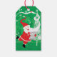 Einfach zu personalisieren Weihnachtsgeschenktafeln, um eine individuelle Nachricht zu erstellen. Vintage Illustration Fröhliches Weihnachtsdesign mit einem fröhlichen, fröhlichen Weihnachtsmann mit einem traditionellen Hut und einem großen Lächeln oder Grinsen, lachen. Der Weihnachtsmann hält Notenblätter, während er versucht, mit seinem langen weißen Bart, der um einen Weihnachtsbaum herum gewickelt ist, zu singen und zu tanzen. Musikalische Noten und Schneeflocken wirbeln um die Luft. Ho ho, Happy Holidays und die Grüße der Jahreszeit!