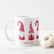Niedliche Weihnachts-personalisierte Weihnachtsferien-Tasse mit sechs niedlichen nordischen Gnomen mit roten und weißen saisonalen skandinavischen Hüten und Melodien. Fügen Sie Ihren Namen in lustige rote Typografie.