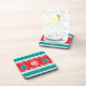 Kunststoff-Untersetzer mit roter/aquamariner gemusterter Bauweise.
