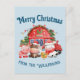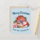 Diese Weihnachtsfeierpostkarte zeigt eine niedliche Aquarellbilder eines Bauernhofs in Cartoon. Kleine Kleintiere sind in Weihnachtsmannmützen außerhalb eines Landhauses gekleidet. Der Hintergrund ist eine hellblaue Farbe.