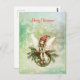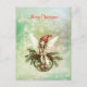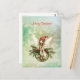 Eine niedliche Fee mit einer roten Kappe sitzt auf einem grünen Weihnachtsschmuck, der mit heiligen Blätter und Beeren geschmückt ist, während Schneeflocken um sie herumwirbeln. Die Worte "Frohe Weihnachten" können leicht auf jeden Gruß geändert werden, den Sie bevorzugen.