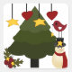 Niedliches Weihnachtsdesign mit einem Vogel, der einen Weihnachtsbaum mit Sternen und Herzen schmückt. Der Vogel ist auf einem Schneemann stehend.