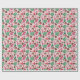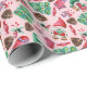 Dieses Verpackungspapier zeigt ein niedliches, in Rot und Grün gekleidetes Aquarellbild mit Weihnachtsbäumen, Kiefernbäumen und Strümpfen mit Süßigkeiten auf rosa Untergrund.