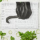 Eine schwarze Katze, die Rasse Bombay, ist am besten in ihrem Urlaub gekleidet, mit Mistleton im Mund und sitzt vor einem verblassten Wortkunst-Hintergrund von MEOW.