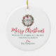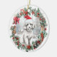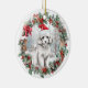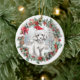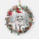 Niedliche Weihnachtsschmuck mit einem süßen, weißen Poodle Hund Welpe in einer Weihnachtsmannmütze in Weihnachten heilig und Beerenkreu. Personalisierter Hund, Welpe, Weihnachtsschmuck im süße Tier (Text auf der Rückseite).