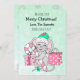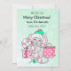 Eine hübsche, handgezogene Kalkkarte mit einer niedlichen Festmaus, die eine Weihnachtsmannmütze trägt, die einen Zuckerrohr trägt und von Geschenken umgeben ist. Fügen Sie einfach Ihre Namen in den personalize Bereich ein. Rosa Weihnachtskarte.