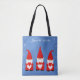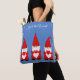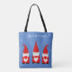 Drei Weihnachtsgnomen und Schneeflocken auf der himmelblauen Tote Tasche. Text kann personalisiert sein.