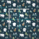 Stoff mit einem skurrilen festlichen Muster. Eisbären, Rentiere, Bäume, Füchse und Schneeflocken. Auf dunkelgrünem Hintergrund.