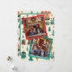 Eine bezaubernde Weihnachtskarte mit einer gemütlichen Vintagen Atmosphäre. Es ist eine Vorlage mit zwei Fotos. Sie können Ihr Familienportrait im personalisierten Bereich hochladen. Der Hintergrund ist niedlich, kleine rote und grüne Weihnachtsbäume und Züge. Die Karte ist in Vintagem Grün, weiß und rot.