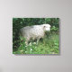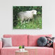 Dieser phantastische Leinwand zeigt ein Foto eines niedlichen, flauschigen Schafes. Die Schafe sind von wilden Blume und langen Gras umgeben und essen einige Blätter. Es hat einen dicken weißen Wollmantel und eine niedliche schwarze Nase.