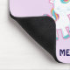 Ein Mousepad mit weißem Mama-Einhorn mit extravaganter farbenfroher Mane und Schwanz. Ein Baby legt sich neben ihr, mit einem grünen Schnuller im Mund. Ein farbenfroher Regenbogen mit flauschigen Wolken, und einige Sterne und ein Herz zieren dieses süße und bezaubernde Design. Eine fett rosa Kontur, die das Bild umgibt, verleiht ihm ein kinderartiges Doodle-Flair. Heller, lila-rosa pastellfarbener Hintergrund.