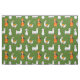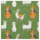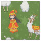 Dieses Spaßgewebe kennzeichnet ein wiederholendes Muster der niedlichen weißen Lamas und der peruanischen Mädchen auf einem grünen Hintergrund mit hellgrüneren Sternen.