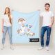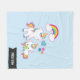 Eine Decke mit einer weißen Mutter einhornt mit extravaganter farbenfroher Mane und Schwanz. Ein Baby legt sich neben ihr, mit einem grünen Schnuller im Mund. Ein farbenfroher Regenbogen mit flauschigen Wolken, und einige Sterne und ein Herz zieren dieses süße und bezaubernde Design. Eine fett rosa Kontur, die das Bild umgibt, verleiht ihm ein kinderartiges Doodle-Flair. Hellblauer Hintergrund.