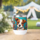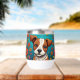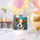 Bezaubernde whimsical ai art mit einem braunen und weißen Welpenhund umgeben von volkstümlichen Blume in Rosa, Orange und lila.