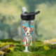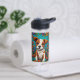 Personalisierte Wasserflasche. Bezaubernde whimsical ai art mit einem braunen und weißen Welpenhund umgeben von volkstümlichen Blume in Rosa, Orange und lila.