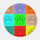 Ein niedliches Muster schwarzer Hundepfoten druckt in farbigen Quadraten. Originelles Dekor.