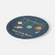 Babyduschen-Party des niedlichen Raumes liefert themed PapierTeller, der die klassischen Babykrippenspielwaren mit einer Raum-Drehungsillustration des Mond-, Raketenschiffs-, Erd-, Planeten- und Baby-Schnullers kennzeichnen, der die traditionellen Spielwaren baumelt und ersetzt. Sterne und Punkte mit dem dunkelblauen Beschaffenheitseffekthintergrund macht den Galaxiehintergrund aus. Personifizieren Sie mit Partymitteilung.