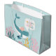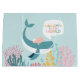 Eine Babydusche-Geschenk-Tasche mit einem süßen Wal mit einem Säugling auf der Rückseite, der durch den Ozean schwimmt und eine bunte Auswahl an Meeresgras und Korallen. Umfasst das Sprichwort "Wal in der Welt".