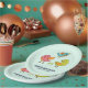 Papierteller mit einem Trio aus niedlichen und skurrilen, handgezeichnet Vögeln. Zwei der Vögel sind stehend, zusammen mit ein paar winzigen grünen Pinienbäumen zwischen ihren Füßen. Ein anderer blauer Vogel fliegt in der Luft zwischen ihnen hoch. Personalisieren Sie Ihre Event-Informationen.