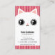 Die hübsche Visitenkarte wurde mit einer originalen Illustration eines niedlichen kawaii Katzengesichts mit schwarz glänzenden Augen entworfen. Das ist beides Seitenaufdruck, bei dem auf der Vorderseite ein Kätzchen mit seinem niedlichen Gesicht und auf der Rückseite eine Katze mit ihrem Schwanz steht. Alle Kontaktinformationen befinden sich auf der Vorderseite der Visitenkarte. Der Hintergrund ist rosa gestreift. Perfekte Visitenkarte für einen Katzensitzer, für Tierärzte oder KatzenStylist.