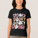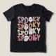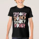 Niedlich Repeat Spooky Girly Halloween Ghost Typografy Girls Tshirt zeigt den Text "Spooky" in modernen lila, orange, weiß und rosa Wiederholskripttypografie akzentuiert eine niedliche Geister und Blume. Ideal für Halloween-Partys. Von Evco Holidays entworfen www.zazzle.com/store/evcoholidays