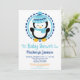 Ein niedlicher Pinguin mit Wintermütze und Schal auf blauem Hintergrund für diese niedliche Babydusche-Einladung.
