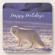 Schöner und niedlicher weißer arktischer Fuchs auf dem Schnee mit dem Text "Happy Holidays". Sie können den Text anpassen oder einfach löschen.
