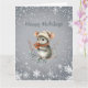 Eine niedliche graue Maus, die in einer Kappe und einem Schal aus Strumpf für den Winter gekleidet ist, hält Beeren und wünscht Ihnen "Happy Holidays". Es ist von einem weißen Schneeflocken-Design umgeben. Der Gruß kann leicht auf alles geändert werden, was Sie bevorzugen.