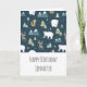 Geburtstagskarte mit einem skurrilen rustikalen Muster. Eisbären, Rentiere, Bäume. Füchse und Schneeflocken. Auf dunkelgrünem Hintergrund.
