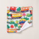 Niedliche Züge auf Gleisen mit großen Bäumen auf blauem Hintergrund.
